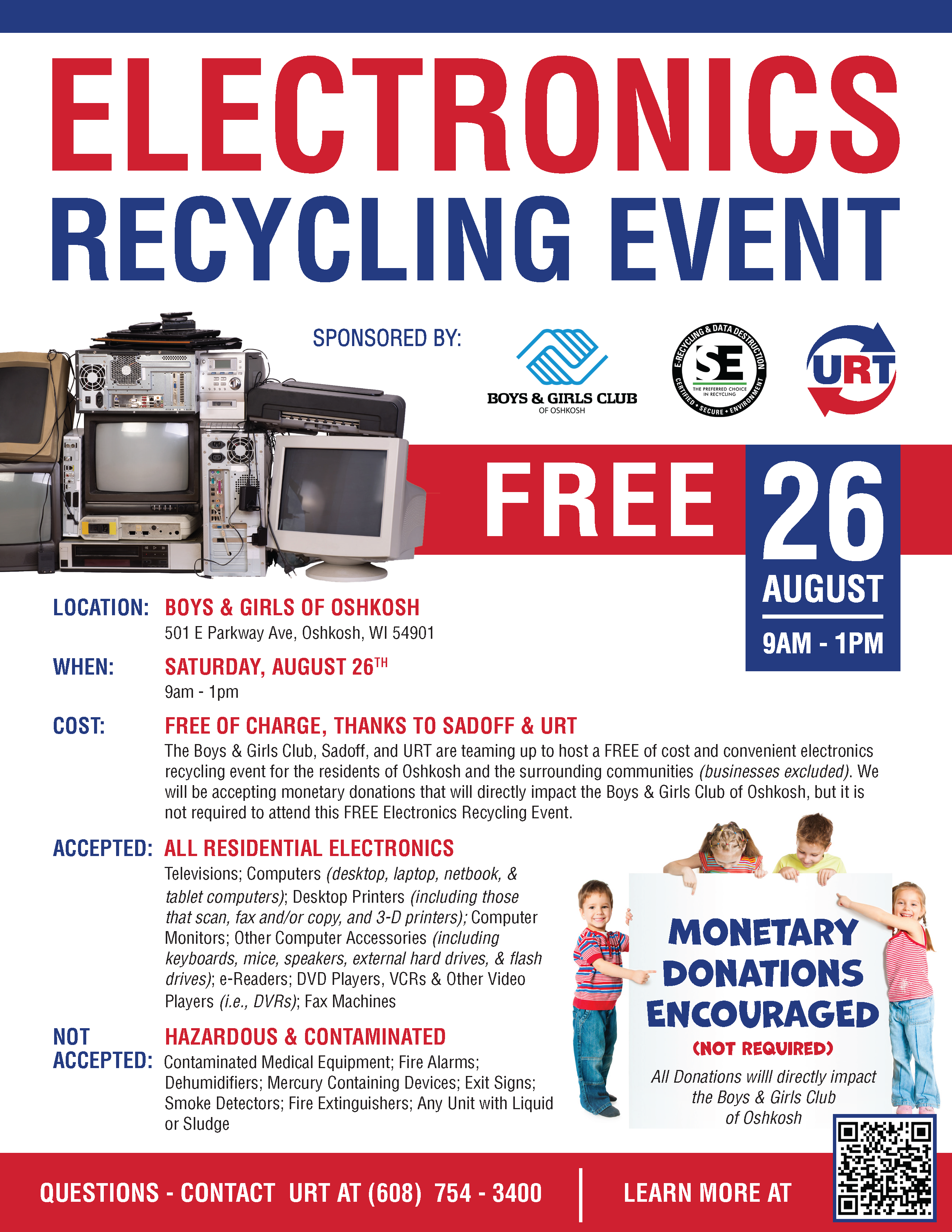 The Boys & Girls Club of Oshkosh, Sadoff, and URT are teaming up to host a FREE-of-cost and convenient electronics recycling event for the residents of Oshkosh and the surrounding communities (businesses excluded). We will be accepting monetary donations that will directly impact the Boys & Girls Club of Oshkosh, but it is not required to attend this FREE Electronics Recycling Event.